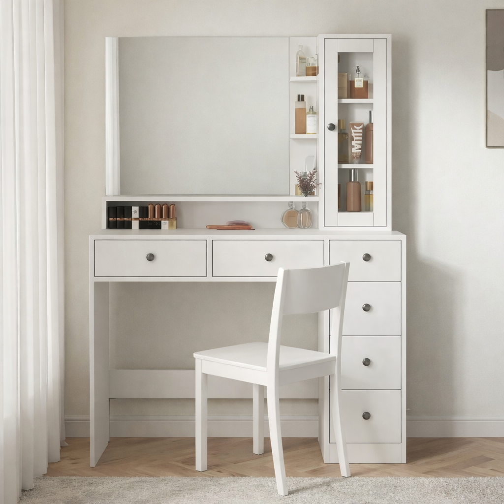 • Tích hợp công nghệ:Đèn LED cung cấp ánh sáng chuẩn để trang điểm, gương gập giúp đa năng hóa mục đích sử dụng (có thể làm bàn học, bàn làm việc).