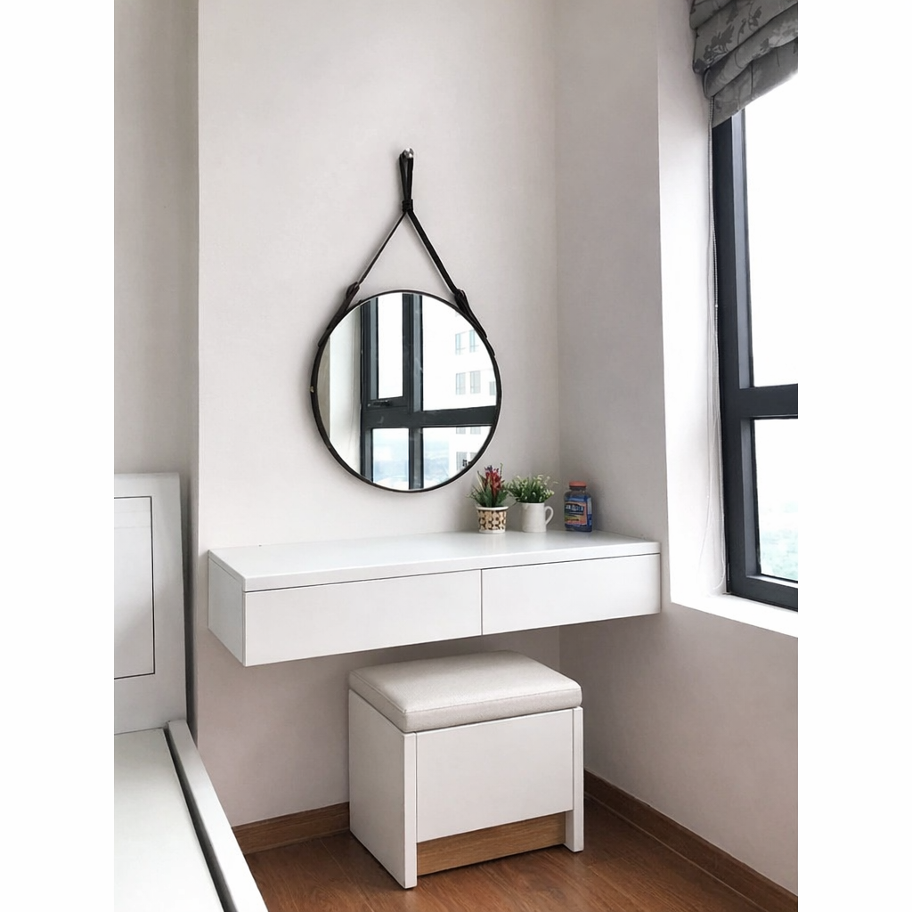1. Bàn trang điểm treo tường:Gắn trực tiếp lên tường, tối ưu không gian cho phòng ngủ nhỏ.