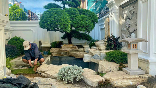 Kết hợp đá, thác nước, cây xanh, đèn trang trí để tạo nên không gian sống động và thư giãn.
