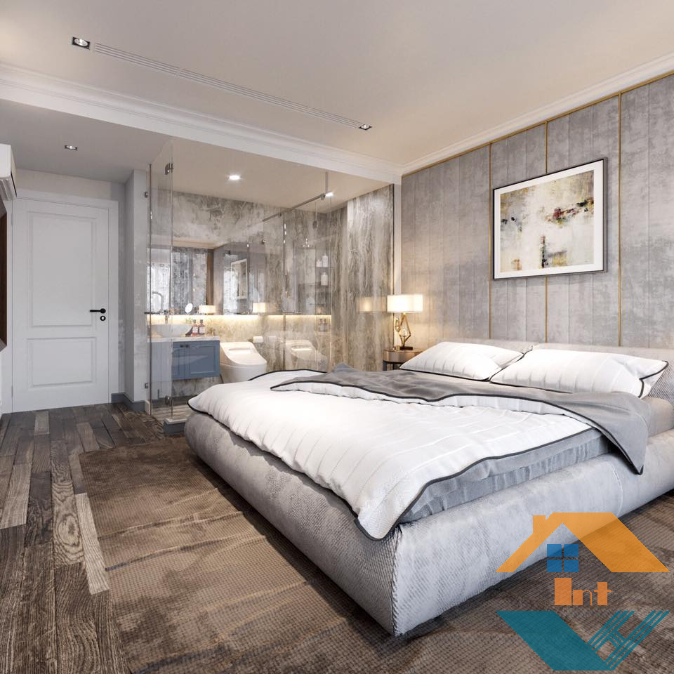 Không gian phòng ngủ được thiết kế kiểu khép kín kết hợp nhà tắm kính ngay bên cạnh chiếc giường rất tiện dụng.