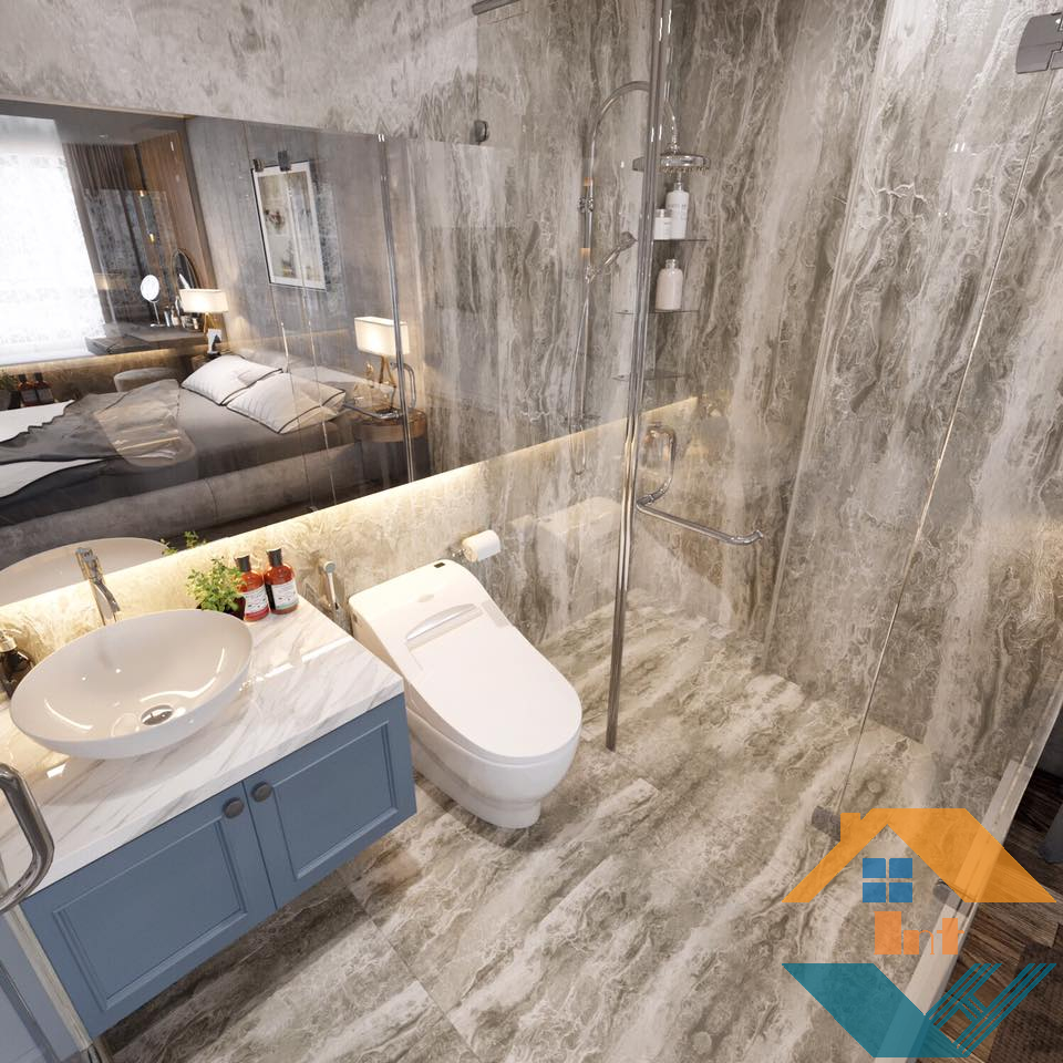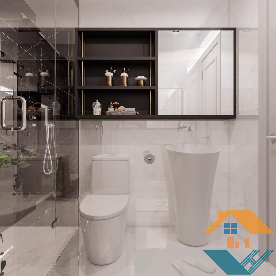 Trong không gian nhà tắm được trang bị thiết bị hiện đại, được thiết kế chiếc kệ treo tường để đồ rất tiện dụng, bên góc là chậu cây xanh mini giúp thanh lọc không khí tăng thẩm mỹ cho không gian.