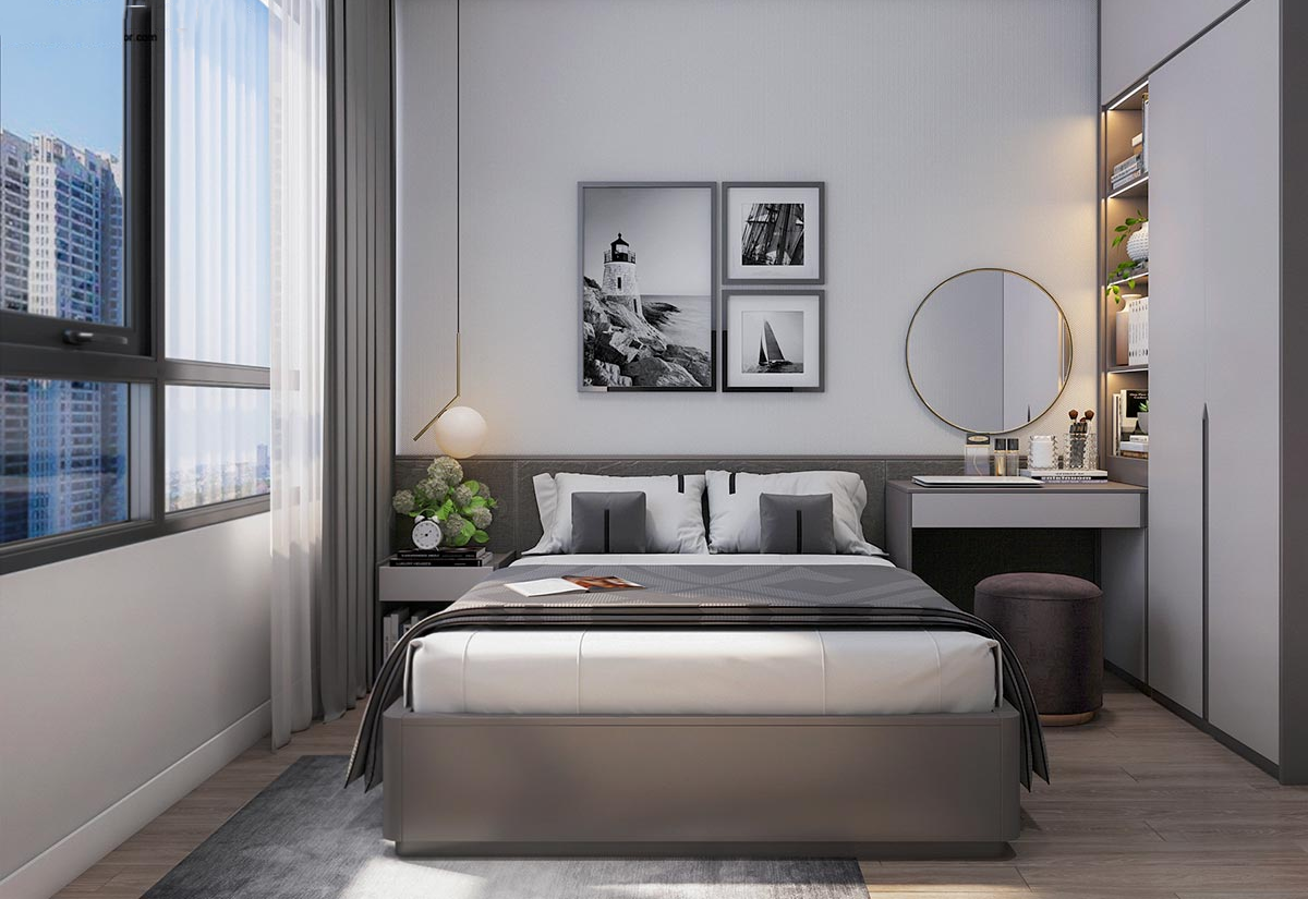 - Màu sắc: Màu trắng, xám, và gỗ tự nhiên là những màu chủ đạo. Những màu sắc này tạo cảm giác sạch sẽ, tươi mới, giúp phòng ngủ luôn sáng sủa.