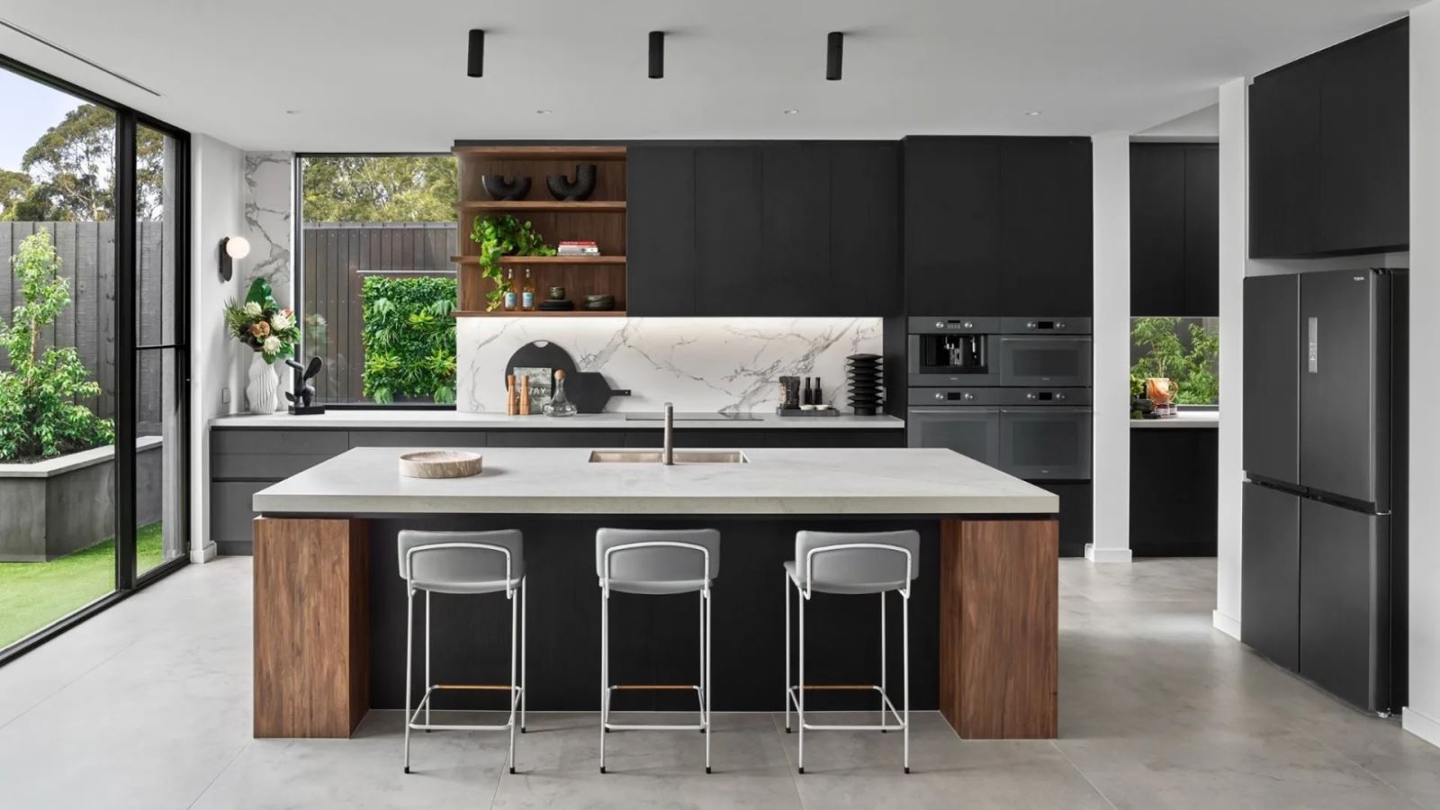 • Bếp lớn có thể phối 2 màu (trên sáng – dưới đậm) để tạo chiều sâu.