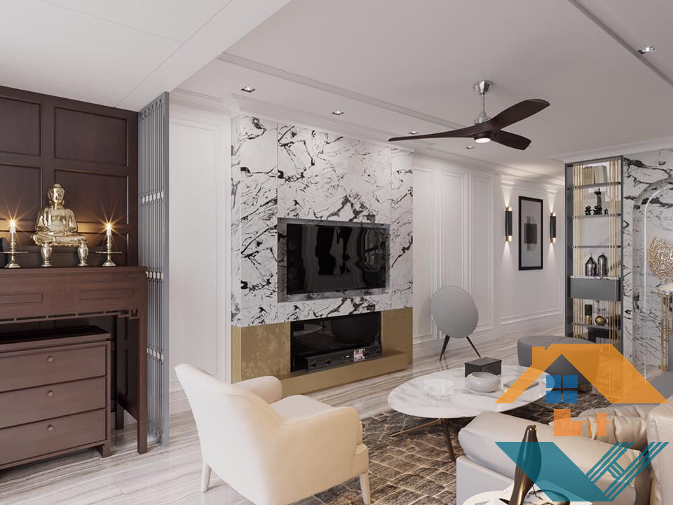 Vị trí tivi được thiết kế trang trí rất khéo léo làm tăng thêm sự chú ý cho gian phòng.