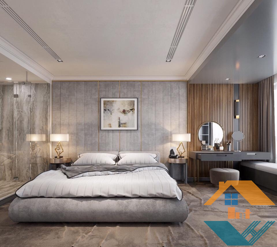 Không gian phòng ngủ được thiết kế kiểu khép kín kết hợp nhà tắm kính ngay bên cạnh chiếc giường rất tiện dụng.