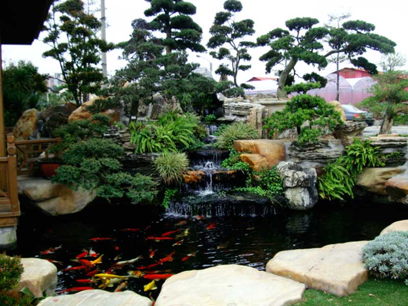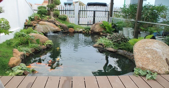Với các sân trước nhà và sau nhà bạn có thể áp dụng thiết kế sân vườn có ao cá, thiết kế hồ cá mini và thác nước.